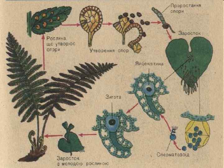 Цикл розвитку папороті Гаметофіт — статеве покоління, на якому утворюються статеві органи — антеридії (чоловічі)'та архегонії (жіночі). Спорофіт — нестатеве покоління, на якому формуються органи нестатевого розмноження — спорангії, в яких утворюються спори.