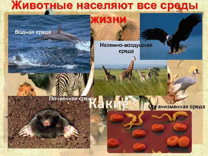 Животные населяют все среды жизни Водная среда Наземно-воздушная среда Какие? Почвенная среда Организменная среда