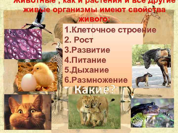 Животные , как и растения и все другие живые организмы имеют свойства живого: 1. Клеточное строение 2. Рост 3. Развитие 4. Питание 5. Дыхание 6. Размножение Какие?