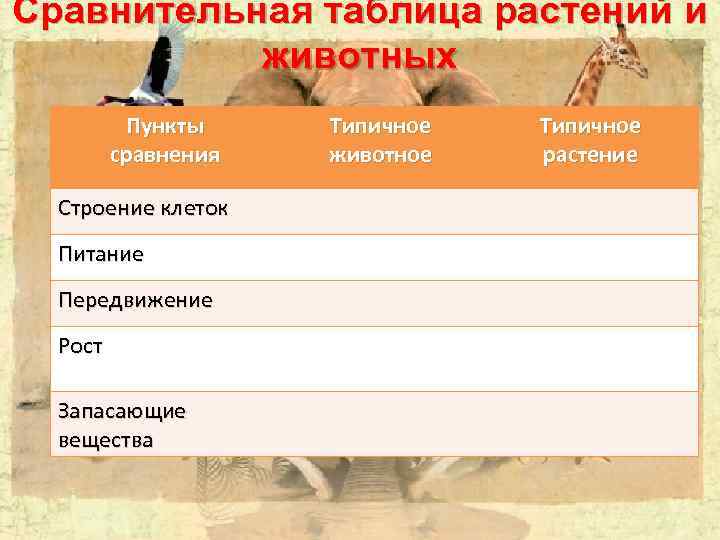 Сравнительная таблица растений и животных Пункты сравнения Строение клеток Питание Передвижение Рост Запасающие вещества Типичное животное Типичное растение