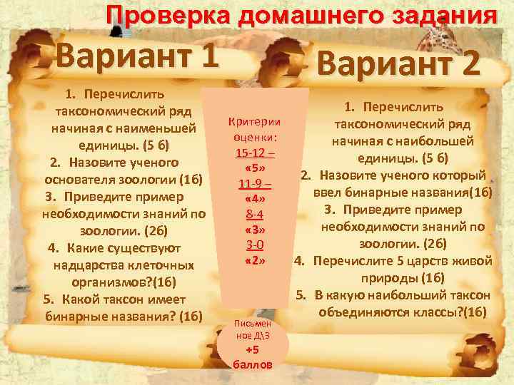 Проверка домашнего задания Вариант 1 1. Перечислить таксономический ряд начиная с наименьшей единицы. (5 б) 2. Назовите ученого основателя зоологии (1 б) 3. Приведите пример необходимости знаний по зоологии. (2 б) 4. Какие существуют надцарства клеточных организмов? (1 б) 5. Какой таксон имеет бинарные названия? (1 б) Вариант 2 1. Перечислить Критерии таксономический ряд оценки: начиная с наибольшей 15 -12 – единицы. (5 б) « 5» 2. Назовите ученого который 11 -9 – ввел бинарные названия(1 б) « 4» 3. Приведите пример 8 -4 необходимости знаний по « 3» зоологии. (2 б) 3 -0 « 2» 4. Перечислите 5 царств живой природы (1 б) 5. В какую наибольший таксон объединяются классы? (1 б) Письмен ное ДЗ +5 баллов