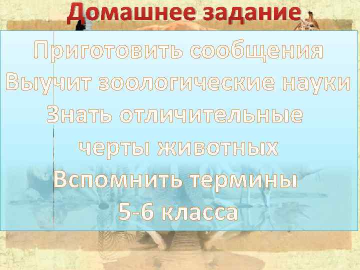 Домашнее задание Приготовить сообщения Выучит зоологические науки Знать отличительные черты животных Вспомнить термины 5 -6 класса