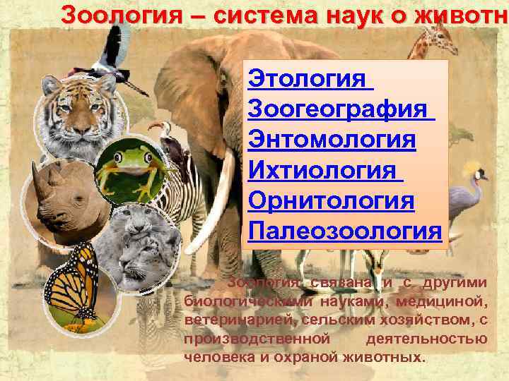 Зоология – система наук о животн Этология Зоогеография Энтомология Ихтиология Орнитология Палеозоология Зоология связана и с другими биологическими науками, медициной, ветеринарией, сельским хозяйством, с производственной деятельностью человека и охраной животных.