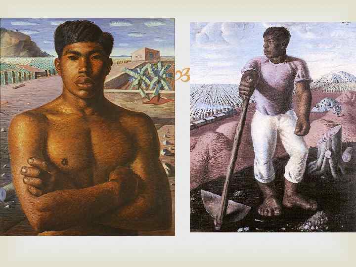 Candido Portinari (1902 -1962) Портинари представлял фигуративное искусство в период, когда абстрактная живопись полностью доминировала. В довоенных картинах, таких как «Кофе» , художник изображает деформированные человеческие фигуры, использует цвета. После начала войны его стиль изменяется под сильным влиянием «Герники» Пикассо. Цвет занимает минимальное место в послевоенном творчестве художника, многие картины выдержаны в серых тонах. (Росписи церкви Франциска Ассизского в Пампулье также монохромны, но выполнены синим). Портинари также известен как иллюстратор, выполнивший иллюстрации к более чем десятку книг. Так, в 1944 году вышла книга классика бразильской литературы Машаду де Ассиса «Посмертные записки Браса Кубаса» с 88 иллюстрациями художника.