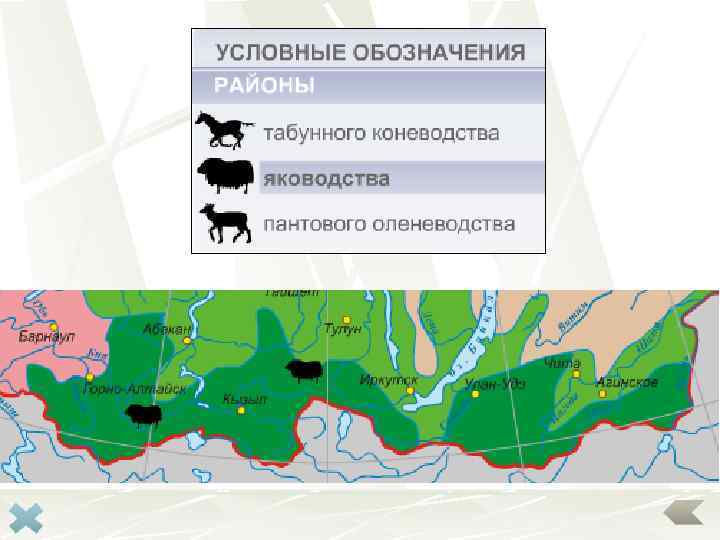 Тесты Ответ 1. Какой из перечисленных видов домашнего скота имеет в России самую большую численность поголовья? 1) овцы 2) олени 3) верблюды 4) крупный рогатый скот 2. Ареалы свиноводства тяготеют к 1) к местам выращивания зерна 2) лесным угодьям 3) предприятиям пищевой промышленности 4) пастбищам 3. Яководство сохранилось 1) Горном Алтае, Туве 2) горном Алтае и Якутии 3) Бурятии и Коми 4) Туве и Дагестане 4. Ценным продуктом мараловодства является 1) молоко 2) мясо 3) шерсть 4) панты