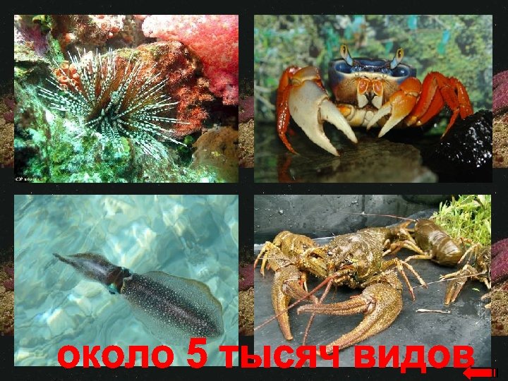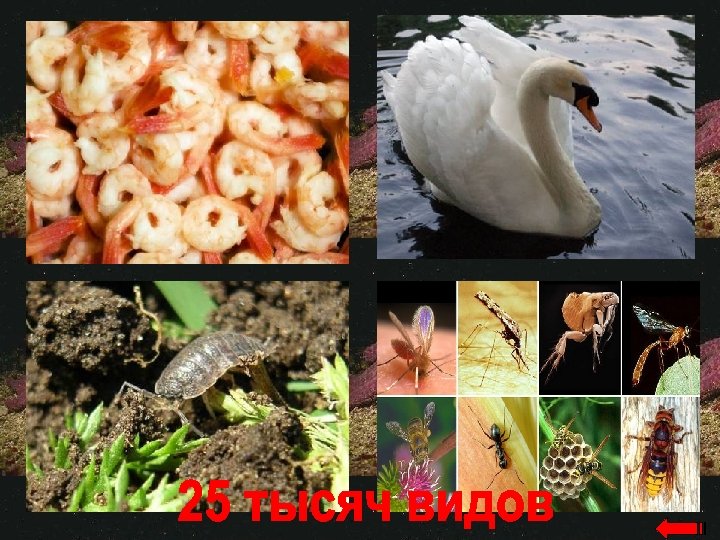 РАКООБРАЗНЫЕ представители - раки; - крабы; - омары; - креветки; - мокрицы. признаки группы Обычно это водные формы, дышащие жабрами. Многие виды употребляются в пищу человеком. Число видов достигает 25 000.