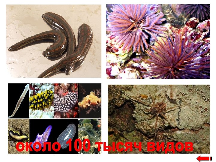 ИГЛОКОЖИЕ представители - морские звёзды; - морские ежи; - морские лилии; - морские огурцы. признаки группы Имеются иголки. Большинство современных иглокожих – ползающие животные, однако, возможно, они произошли от сидячих предков. Современных видов около 5000.