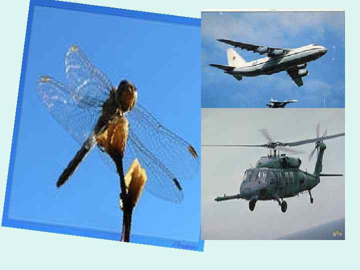 Из истории авиации Долгое время проблемой скоростной авиации был флаттер — внезапно и бурно возникающие на определенной скорости вибрации крыльев. Из-за этих вибраций самолет разваливался в воздухе за несколько секунд. Конструкторы нашли выход — крылья стали делать с утолщением на конце, которые были обнаружены на концах крыльев стрекозы. Новые принципы полета, бесколесного движения, построения подшипников и т. д. разрабатываются на основе изучения полета птиц и насекомых, движения прыгающих животных, строения суставов.