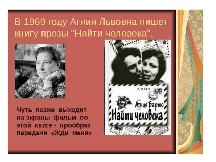 Во время Великой Отечественной Барто много выступала по радио, ездила на фронт корреспондентом от газеты. В послевоенные годы Агния Львовна стала организатором движения по поиску разлученных во время войны семей. Она предложила разыскивать потерявшихся родителей по детским воспоминаниям. Через программу "Найти человека" на радио "Маяк" удалось соединить 927 разлученных семейств. Первая книга прозы писательницы называется так и называется - "Найти человека".