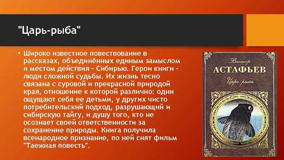 "Царь-рыба" • Широко известное повествование в рассказах, объединённых единым замыслом и местом действия - Сибирью. Герои книги люди сложной судьбы. Их жизнь тесно связана с суровой и прекрасной природой края, отношение к которой различно: одни ощущают себя ее детьми, у других чисто потребительский подход, разрушающий и сибирскую тайгу, и душу того, кто не осознает своей ответственности за сохранение природы. Книга получила всенародное признание, по ней снят фильм "Таежная повесть".