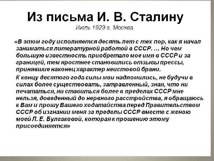 Булгаков и Сталин Писатель впал в глубокое отчаяние. Искал любую работу, но его не брали. Думал о самоубийстве. 28. 03. 1930 г. Написал письмо Советскому правительству с просьбой определить его судьбу и, либо дать право эмигрировать, либо предоставить возможность работать режиссером-ассистентом во МХАТе.