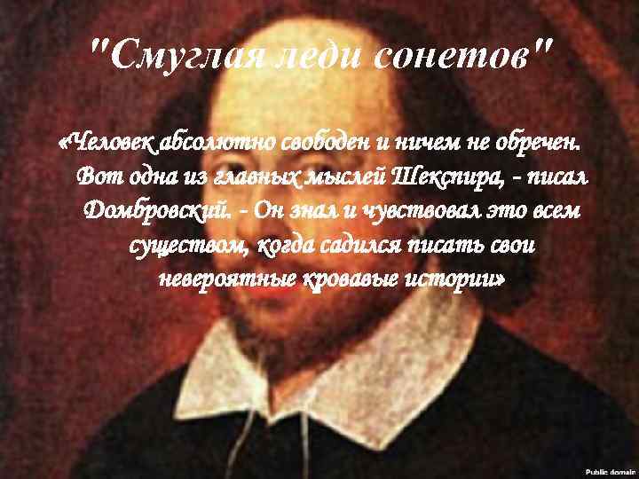 "Смуглая леди сонетов" «Человек абсолютно свободен и ничем не обречен. Вот одна из главных мыслей Шекспира, - писал Домбровский. - Он знал и чувствовал это всем существом, когда садился писать свои невероятные кровавые истории»