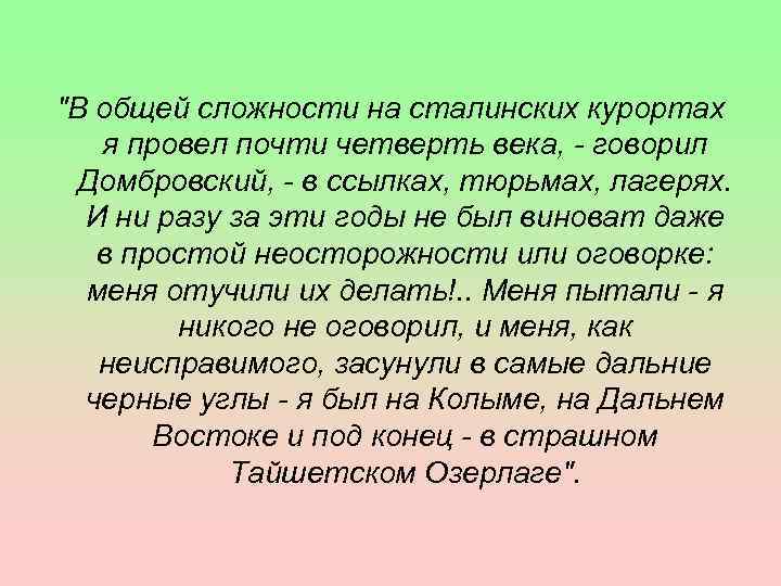 "В общей сложности на сталинских курортах я провел почти четверть века, - говорил Домбровский, - в ссылках, тюрьмах, лагерях. И ни разу за эти годы не был виноват даже в простой неосторожности или оговорке: меня отучили их делать!. . Меня пытали - я никого не оговорил, и меня, как неисправимого, засунули в самые дальние черные углы - я был на Колыме, на Дальнем Востоке и под конец - в страшном Тайшетском Озерлаге".