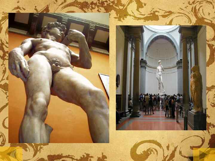 Статуя Давида Микеланджело изобразил Давида не в виде хрупкого подростка, попирающего отрубленную голову Голиафа, как это делали мастера 15 в. , а как прекрасного, атлетически сложенного гиганта в момент перед сражением, полного уверенности и грозной силы