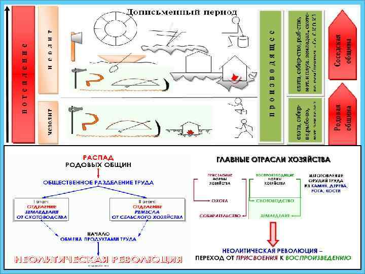 Еще больших достижений люди достигли в период неолита. Орудия труда, изготовленные из камня, достигли совершенства: каменный топор, серп и мотыга. Великими изобретениями стали: лодка, колесо и рало. Люди эпохи неолита стали строить поселения, состоящие из наземных домов, и вести оседлый образ жизни. Основными видами их занятий являлись охота, собирательство, рыболовство, мотыжное и плужное земледелие, скотоводство и ремесло. Орудия труда позволяют теперь отдельной семье самостоятельно обеспечивать себя всем необходимым для выживания. Потребность в родовых общинах отпадает и они начинают распадаться. На месте родовых общин появляются соседские общины.