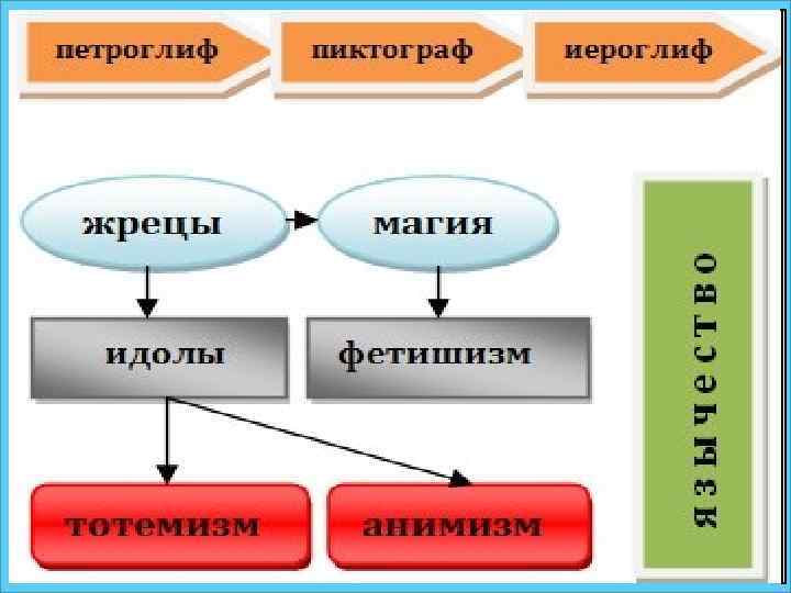 Первобытные люди полагали, что имеют кровную связь с некоторыми животными. Эта вера получила название тотемизм. Вера в бессмертие души, в существовании невидимых духов получила название анимизм. Изображения тотемных животных и невидимых духов из камня и дерева получили название идолов. Чтобы задобрить идолов необходимо было совершать определённые обряды около них, приносить жертвы. Это могли делать только особые люди – жрецы. Наряду с жрецами некоторые люди уверяли, что могут влиять на сверхъестествен-ные силы, колдовать. Такую веру называли ма-гией. В магии большое место уделялось вере в сверхъестественную силу некоторых «священ-ных» вещей (амулеты, обереги и т. п. ). Такая ве-ра называется фетишизмом. Вера во множе-ство духов и богов, обожествление сил приро-ды получило название язычества. Первобыт-ные люди были язычниками.