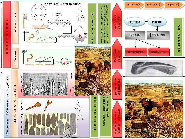 Неолитическая революция изменила хозяйство и быт первобытных людей. У них стало появляться больше свободного времени, что привело к появлению зачатков культуры (искусства и письменности) и религиозных верований. Люди стали украшать свои орудия труда, оружие, предметы быта и одежду вкладывая в это религиозный смысл. Для того, чтобы передавать свой опыт и знания другим поколениям они начали фиксировать информацию с помощью рисунков на камнях. Эти рисунки пролучили название петроглифов и передавали большой объём информации. Рисовали не только на камнях но, и на других материалах. Письмо с помощью рисунков получило название пиктография (рисуночное письмо). Однако эти рисунки можно было расшифровать по-разному. Поэтому древние люди стали упрощать эти рисунки до нескольких линий, которые стали обозначать конкретное слово или слог. Эти условные рисунки стали называть иероглифы.