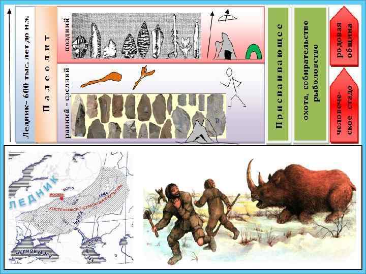 Как мы уже говорили, дописьменную историю человечества учёные разделили на исторические эпохи. В свою очередь палеолит (древнекаменный век) они разделили три периода: ранний, средний и поздний. В эпоху палеолита на Земле был так называемый ледниковый период, когда ледник продвинулся далеко на юг. Но, примерно, 600 тысяч лет ледник начал отступать и начался период потепления, который продолжается до настоящего времени. В раннем палеолите человек имел очень ограниченный набор орудий труда. Это - каменное рубило, дубинка и палка-копалка, с помощью которой первобытные люди добывали съедобные коренья, плоды, ягоды, мелких животных, личинки насекомых из земли, т. е. всё съедобное. Для жилища человек использовал природные пещеры, так как ещё не умел строить жилища и не имел для этого необходимых орудий труда.