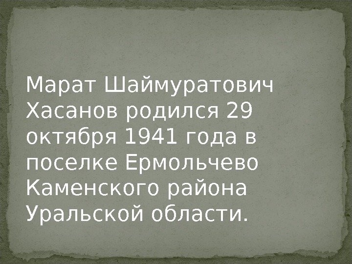 Марат Шаймуратович Хасанов родился 29 октября 1941 года в поселке Ермольчево Каменского района Уральской области.