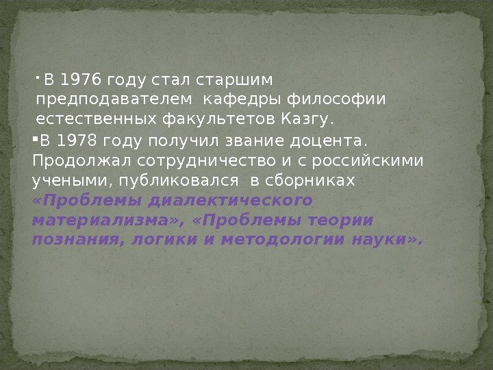 В 1976 году стал старшим предподавателем кафедры философии естественных факультетов Казгу. В 1978 году получил звание доцента. Продолжал сотрудничество и с российскими учеными, публиковался в сборниках «Проблемы диалектического материализма» , «Проблемы теории познания, логики и методологии науки» .