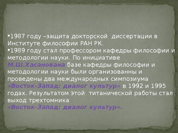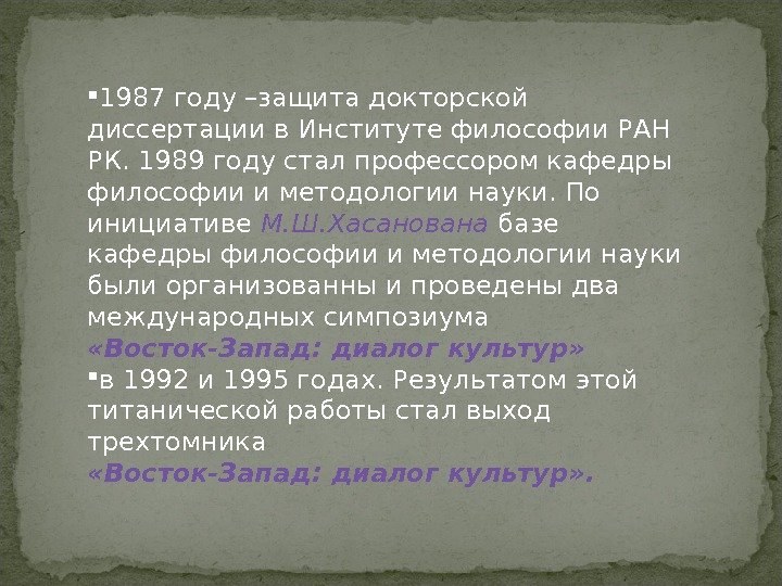 1987 году –защита докторской диссертации в Институте философии РАН РК. 1989 году стал профессором кафедры философии и методологии науки. По инициативе М. Ш. Хасанована базе кафедры философии и методологии науки были организованны и проведены два международных симпозиума «Восток-Запад: диалог культур» в 1992 и 1995 годах. Результатом этой титанической работы стал выход трехтомника «Восток-Запад: диалог культур» .