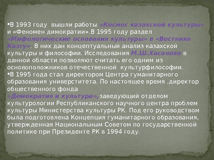 В 1993 году вышли работы «Космос казахской культуры» и «Феномен димократии» . В 1995 году раздел «Мифологические основания культуры» в «Вестнике Казгу» . В них дан концептуальный анализ казахской культуры и философии. Исследования М. Ш. Хасанова в данной области позволяют считать его одним из основоположников отечественной культурфилософии. В 1995 года стал директором Центра гуманитарного образования универститета. По настоящее время , директор общественного фонда «Демократия и культура» , заведующий отделом культурологии Республиканского научного центра проблем культуры Министерства культуры РК. Под его руководством была подготовлена Концепция гуманитарного образования, утвержденная Национальным Советом по государственной политике при Президенте РК в 1994 году.
