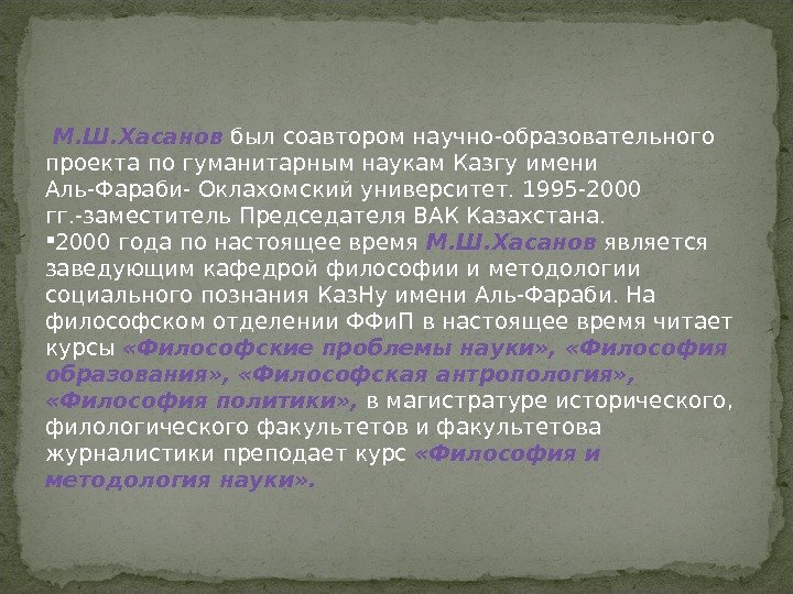 М. Ш. Хасанов был соавтором научно-образовательного проекта по гуманитарным наукам Казгу имени Аль-Фараби- Оклахомский университет. 1995 -2000 гг. -заместитель Председателя ВАК Казахстана. 2000 года по настоящее время М. Ш. Хасанов является заведующим кафедрой философии и методологии социального познания Каз. Ну имени Аль-Фараби. На философском отделении ФФи. П в настоящее время читает курсы «Философские проблемы науки» , «Философия образования» , «Философская антропология» , «Философия политики» , в магистратуре исторического, филологического факультетов и факультетова журналистики преподает курс «Философия и методология науки» .