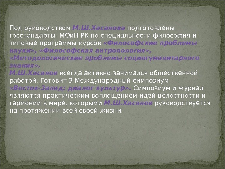 Под руководством М. Ш. Хасанова подготовлены госстандарты МОи. Н РК по специальности философия и типовые программы курсов «Философские проблемы науки» , «Философская антропология» , «Методологические проблемы социогуманитарного знания» . М. Ш. Хасанов всегда активно занимался общественной работой. Готовит 3 Международный симпозиум «Восток-Запад: диалог культур» . Симпозиум и журнал являются практическим воплощением идей целостности и гармонии в мире, которыми М. Ш. Хасанов руководствуется на протяжении всей своей жизни.