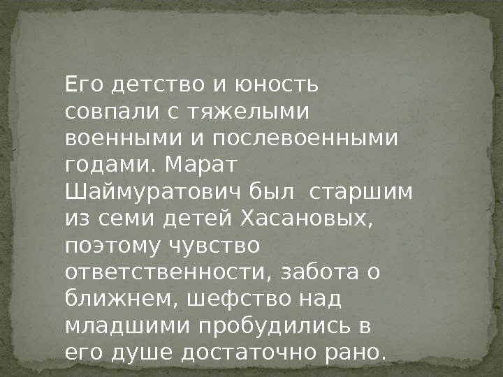 Его детство и юность совпали с тяжелыми военными и послевоенными годами. Марат Шаймуратович был старшим из семи детей Хасановых, поэтому чувство ответственности, забота о ближнем, шефство над младшими пробудились в его душе достаточно рано.