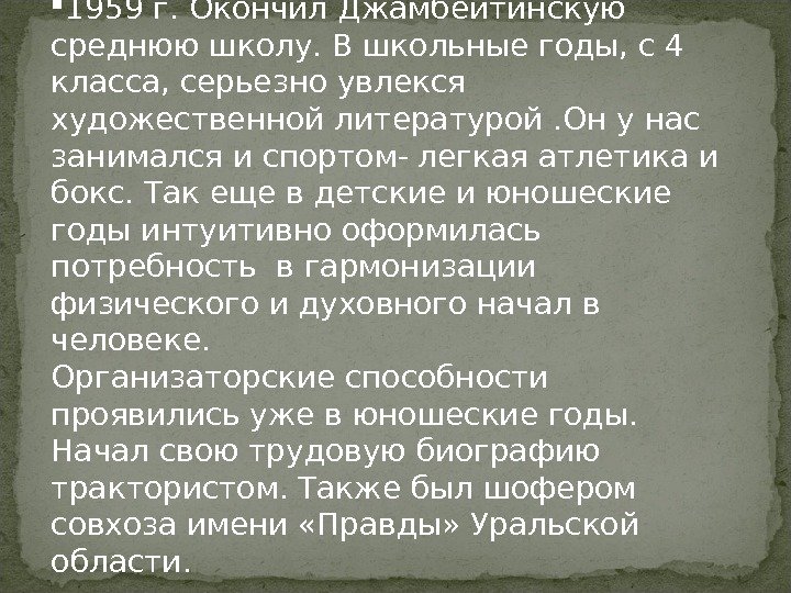 1959 г. Окончил Джамбейтинскую среднюю школу. В школьные годы, с 4 класса, серьезно увлекся художественной литературой. Он у нас занимался и спортом- легкая атлетика и бокс. Так еще в детские и юношеские годы интуитивно оформилась потребность в гармонизации физического и духовного начал в человеке. Организаторские способности проявились уже в юношеские годы. Начал свою трудовую биографию трактористом. Также был шофером совхоза имени «Правды» Уральской области.