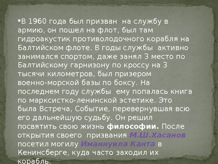 В 1960 года был призван на службу в армию, он пошел на флот, был там гидроакустик противолодочного корабля на Балтийском флоте. В годы службы активно занимался спортом, даже занял 3 место по Балтийскому гарнизону по кроссу на 3 тысячи километров, был призером военно-морской базы по боксу. На последнем году службы ему попалась книга по марксистко-ленинской эстетике. Это была Встреча, Событие, перевернувшая всю его дальнейшую судьбу. Он решил посвятить свою жизнь философии. После открытия своего призвания М. Ш. Хасанов посетил могилу Иманнуила Канта в Кенинсберге, куда часто заходил их корабль.