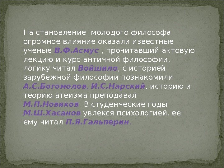 На становление молодого философа огромное влияние оказали известные ученые В. Ф. Асмус , прочитавший актовую лекцию и курс античной философии, логику читал Войшило , с историей зарубежной философии познакомили А. С. Богомолов , И. С. Нарский , историю и теорию атеизма преподавал М. П. Новиков. В студенческие годы М. Ш. Хасанов увлекся психологией, ее ему читал П. Я. Гальперин.