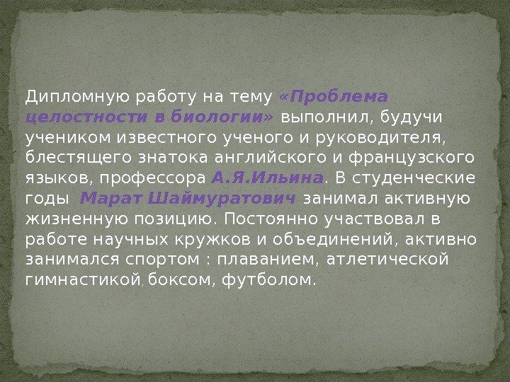 Дипломную работу на тему «Проблема целостности в биологии» выполнил, будучи учеником известного ученого и руководителя, блестящего знатока английского и французского языков, профессора А. Я. Ильина. В студенческие годы Марат Шаймуратович занимал активную жизненную позицию. Постоянно участвовал в работе научных кружков и объединений, активно занимался спортом : плаванием, атлетической гимнастикой , боксом, футболом.