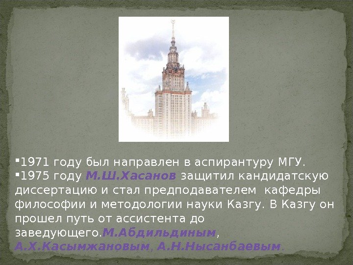 1971 году был направлен в аспирантуру МГУ. 1975 году М. Ш. Хасанов защитил кандидатскую диссертацию и стал предподавателем кафедры философии и методологии науки Казгу. В Казгу он прошел путь от ассистента до заведующего. М. Абдильдиным , А. Х. Касымжановым , А. Н. Нысанбаевым.