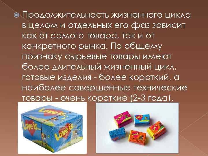 Продолжительность жизненного цикла в целом и отдельных его фаз зависит как от самого товара, так и от конкретного рынка. По общему признаку сырьевые товары имеют более длительный жизненный цикл, готовые изделия - более короткий, а наиболее совершенные технические товары - очень короткие (2 -3 года).