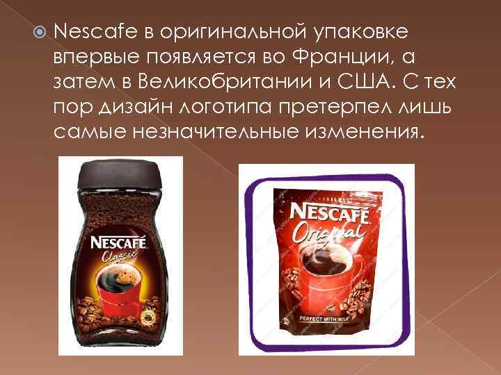 Nescafe в оригинальной упаковке впервые появляется во Франции, а затем в Великобритании и США. С тех пор дизайн логотипа претерпел лишь самые незначительные изменения.