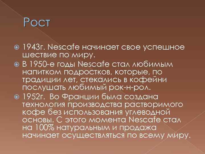 Рост 1943 г. Nescafe начинает свое успешное шествие по миру. В 1950 -е годы Nescafe стал любимым напитком подростков, которые, по традиции лет, стекались в кофейни послушать любимый рок-н-рол. 1952 г. Во Франции была создана технология производства растворимого кофе без использования углеводной основы. С этого момента Nescafe стал на 100% натуральным и продажа начинает осуществляться по всему миру.