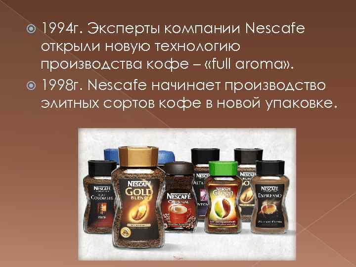 1994 г. Эксперты компании Nescafe открыли новую технологию производства кофе – «full aroma» . 1998 г. Nescafe начинает производство элитных сортов кофе в новой упаковке.