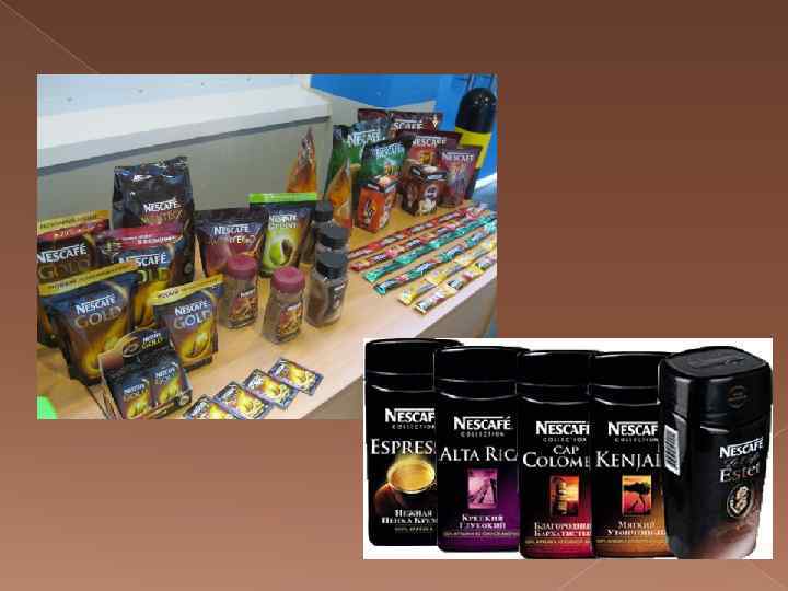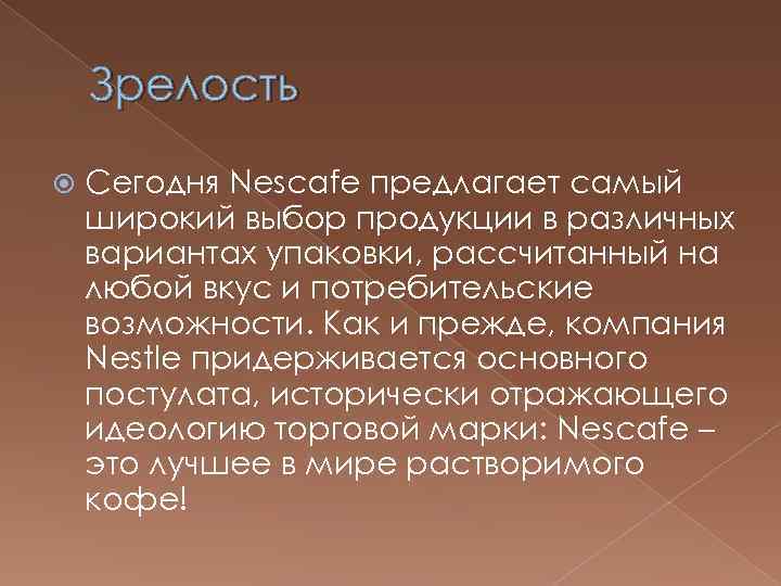 Зрелость Сегодня Nescafe предлагает самый широкий выбор продукции в различных вариантах упаковки, рассчитанный на любой вкус и потребительские возможности. Как и прежде, компания Nestle придерживается основного постулата, исторически отражающего идеологию торговой марки: Nescafe – это лучшее в мире растворимого кофе!