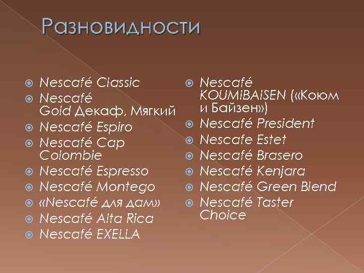 Разновидности Nescafé Classic Nescafé Gold Декаф, Мягкий Nescafé Espiro Nescafé Cap Colombie Nescafé Espresso Nescafé Montego «Nescafé для дам» Nescafé Alta Rica Nescafé EXELLA Nescafé KOUMIBAISEN ( «Коюм и Байзен» ) Nescafé President Nescafe Estet Nescafé Brasero Nescafé Kenjara Nescafé Green Blend Nescafé Taster Choice