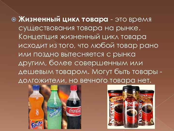 Жизненный цикл товара - это время существования товара на рынке. Концепция жизненный цикл товара исходит из того, что любой товар рано или поздно вытесняется с рынка другим, более совершенным или дешевым товаром. Могут быть товары долгожители, но вечного товара нет.