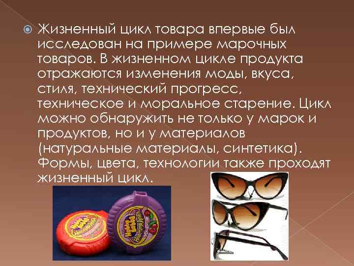 Жизненный цикл товара впервые был исследован на примере марочных товаров. В жизненном цикле продукта отражаются изменения моды, вкуса, стиля, технический прогресс, техническое и моральное старение. Цикл можно обнаружить не только у марок и продуктов, но и у материалов (натуральные материалы, синтетика). Формы, цвета, технологии также проходят жизненный цикл.