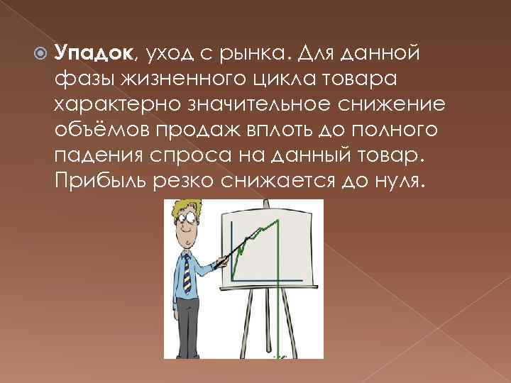 Упадок, уход с рынка. Для данной фазы жизненного цикла товара характерно значительное снижение объёмов продаж вплоть до полного падения спроса на данный товар. Прибыль резко снижается до нуля.