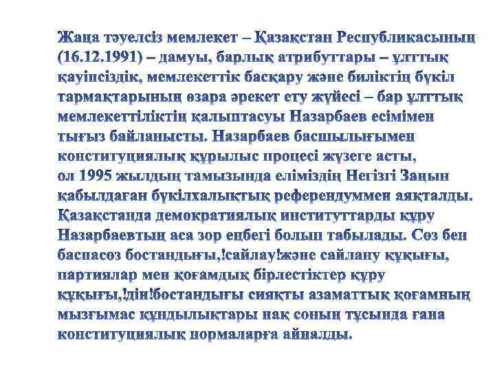 1992 ж «Қазақстанның егеменді мемлекет ретінде қалыптасуы мен даму стратегиясын» әзірлеп, елдің ішкі және сыртқы саясатының бағытбағдарын айқындады «Қазақстан-2030» стратегиясы мемлекет дамуының басым бағыттарын айқындады 1997 жылдың басына қарай елде макроэкономика лық тұрақтылық орын алды ҚР-нын бәсекеге қабілетті 50 елдің қатарына кіру стратегиясы белгіленген