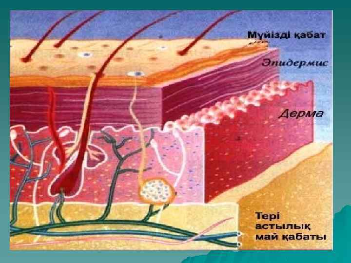 Терінің қосалқы мүшелері Эпидермис Дерма Емізікті қабат Тер бездері Түтіктер Сүт бездері Тырнақ Торлы қабат Май бездері