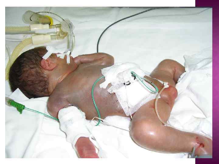 Бала айқын жалпы ісінулермен және іштің көлемінің ұлғаюымен (асцит, гепатоспленомегалия салдарынан) туылады. Дене салмағы үлкен болған жағдайда морфо- функциональды жетілмеу белгілері болады. ОЖЖ – нің тежелу симптомы (адинамия, атония, арефлексия) көрінеді. Күрт бозару, геморрагиялық тән. Салыстырмалы жүрек тұйықтылығының шекарасы кеңейген, бұл жедел жүрек жеткіліксіздігінің белгісі болып табылады. Бұл науқастарда тыныс алу бұзылыстары өкпенің гипоплазиясымен негізделген, ол құрсақ ішілік ұлғайған бауырымен қысылған және өкпенің жетілмеуі, БГМ салдарынан жиі дамиды.