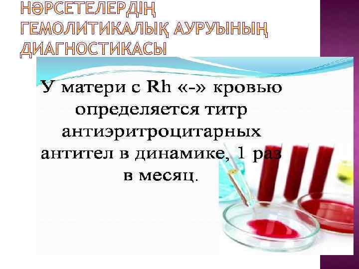 — жалпы қан анализінде анемия, плоицеьамия және гемолиз бар жоғын анықтау. Гемоглобиннің, эритроциттердің, тромбоциттердің төмендеуі, ретикулоциттер 7 ‰ –ден жоғары, нормобласттар 50% — дан жоғары, әлсіз лейкоцитоз байқалады. Ретикулоциттердің деңгейінің динамикасының өзгеруі: мерзіміне жетіп туылған дені сау нәрестеде ретикулоциттердің қалыпты деңгейі 7%, ал шала туылғандарда — 15%, мерзіміне жетіп туылған нәрестелер үшін 7 күнде, ал шала туылған нәрестелерде 15 күнделікті 1% — ға төмендеп, деңгейі< 1% дейін төмендейді. — иммунологиялық зерттеулер: Кумбстың тура реакциясы, антиген –антидене комплексінің бар жоғын анықтау. Зерттеу материалы болып нәрестелердің эритроциттері болып табылады. Топтық сәйкессіздік бұл реакция алғашқы 2 -3 күнде оң болады, Rhконфликтте – туылған сәттен бастап оң болады; — Кумбстың тура емес реакциясы, бос блоктаушы Ig. G – антиденелердің болуын куәландырады, бұл үшін науқас баланың немесе анның сарысуын қолдананды. Реакция 1 -2 тәулікте оң болады.