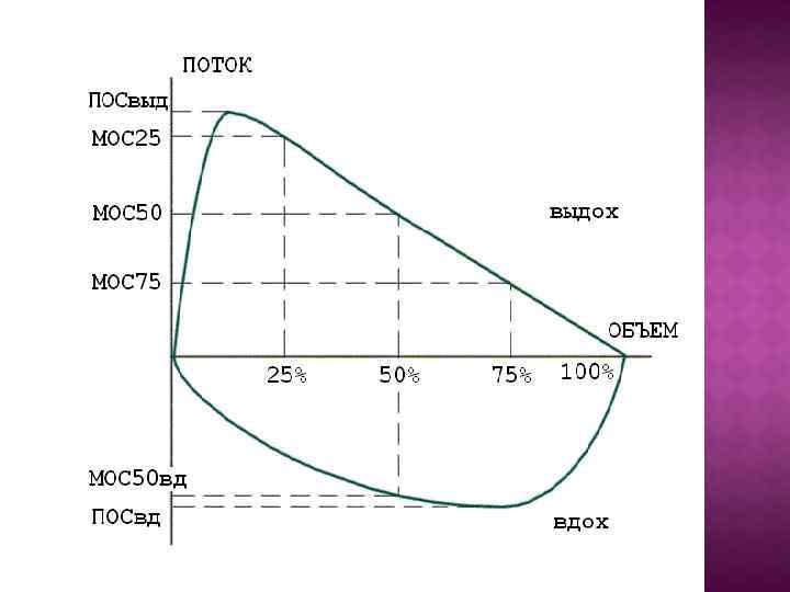 ӨФТС ТЕСТІ ФЖЕЛ = ФЖЕЛвыд (FVC = forced vital capacity) - (проба Тиффно). Өкпенің өмірлік форсирленген сыйымдылығы- тез арадағы және куш тускендегі дем шығару көлемі. ОФВ 1 (FEV 1 = forced expiratory volume in 1 sec) - 1 секунд ишиндегі дем алу-алғашқы сәттердегі дем шығарғандағы көлемі. ОФВ 3 (FEV 3 = forced expiratory volume in 3 sec) – 3 секунд арасындағы дем шгару көлемі. ОФВпос = ОПОС (FEVPEF) ПИК кезіндегі көлемнің жылдамдығы. СОС 25 -75 (MEF 25 -75) – 25 пен 75 арасындағы өкпенің жылдамдық СОС 75 -85 (MEF 75 -85) – 25 пен 85 арасындағы өкпенің жылдамдық СОС 0. 2 -1. 2 – 200 пен 250 арасындағы өкпенің жылдамдық көлемі орташа