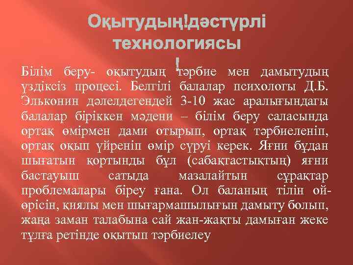 Дәстүрлі оқыту технологиясының кемшілігі v Дайын білімді хабарлайды, оқушы орындаушы, мұғалім басқарушы болады.
