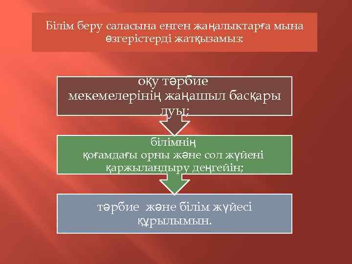 Білім беру саласына енген жаңалыктарға мына өзгерістерді жатқызамыз: оқу тәрбие мекемелерінің жаңашыл басқары луы; білімнің қоғамдағы орны және сол жүйені қаржыландыру деңгейін; тәрбие және білім жүйесі құрылымын.